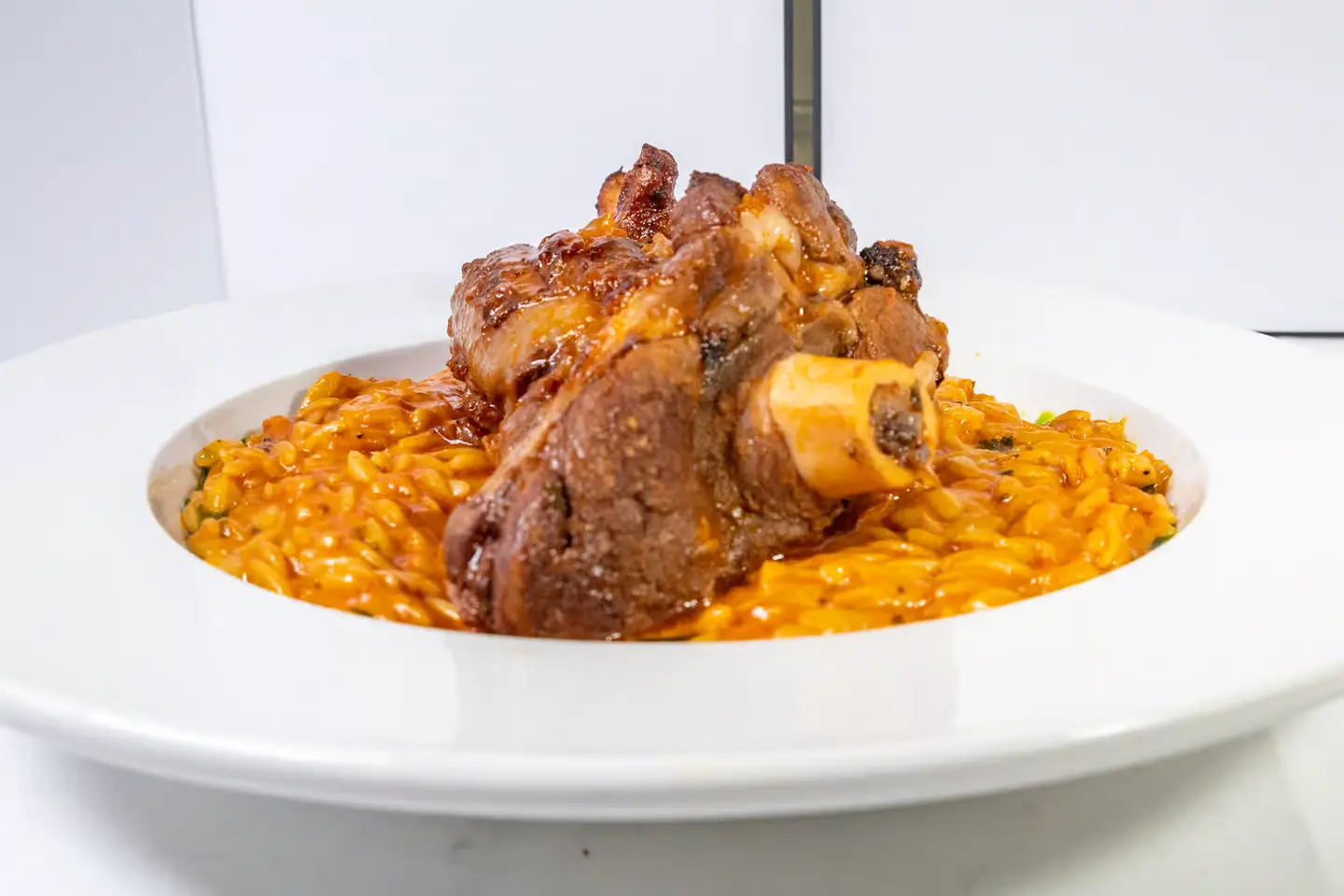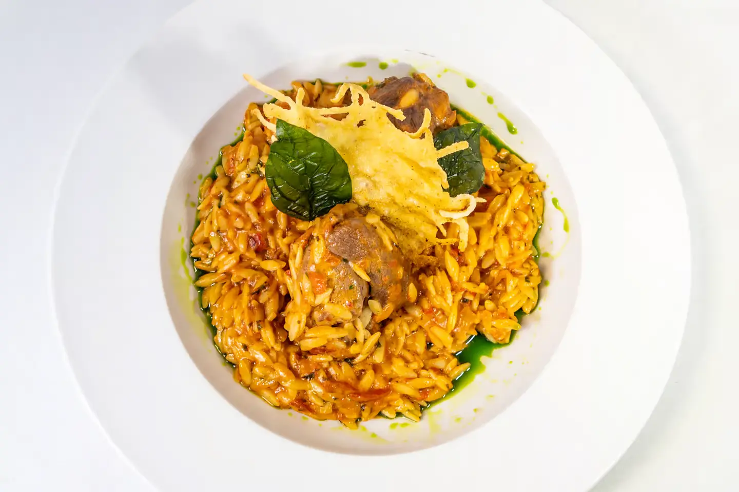 Slow cooked lamb with orzo pasta in a light garlic tomato sauce with hint of tabasco and creame, topped with parmesan cheese