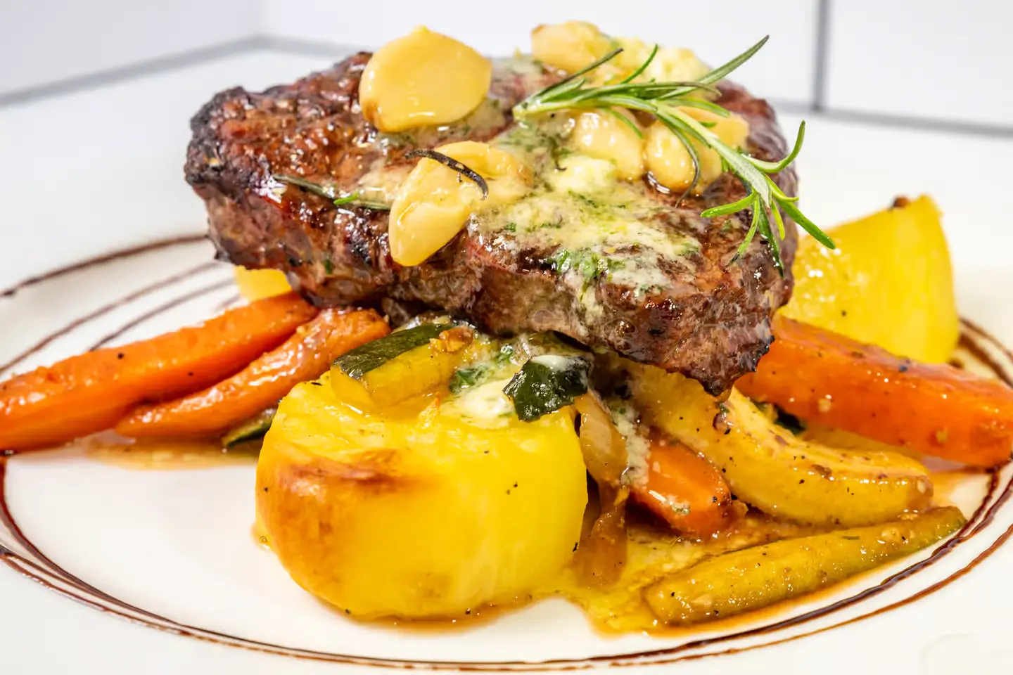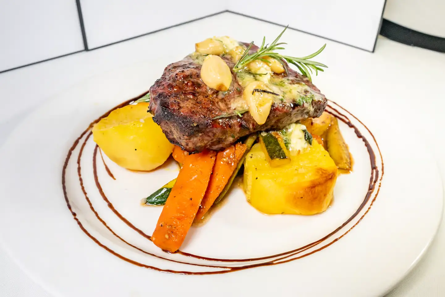 8 Ounce grilled tender filet, flamed on a sweet red wine, topped with garlic butter sauce. Served with oven potatoes and sautéed veggies
