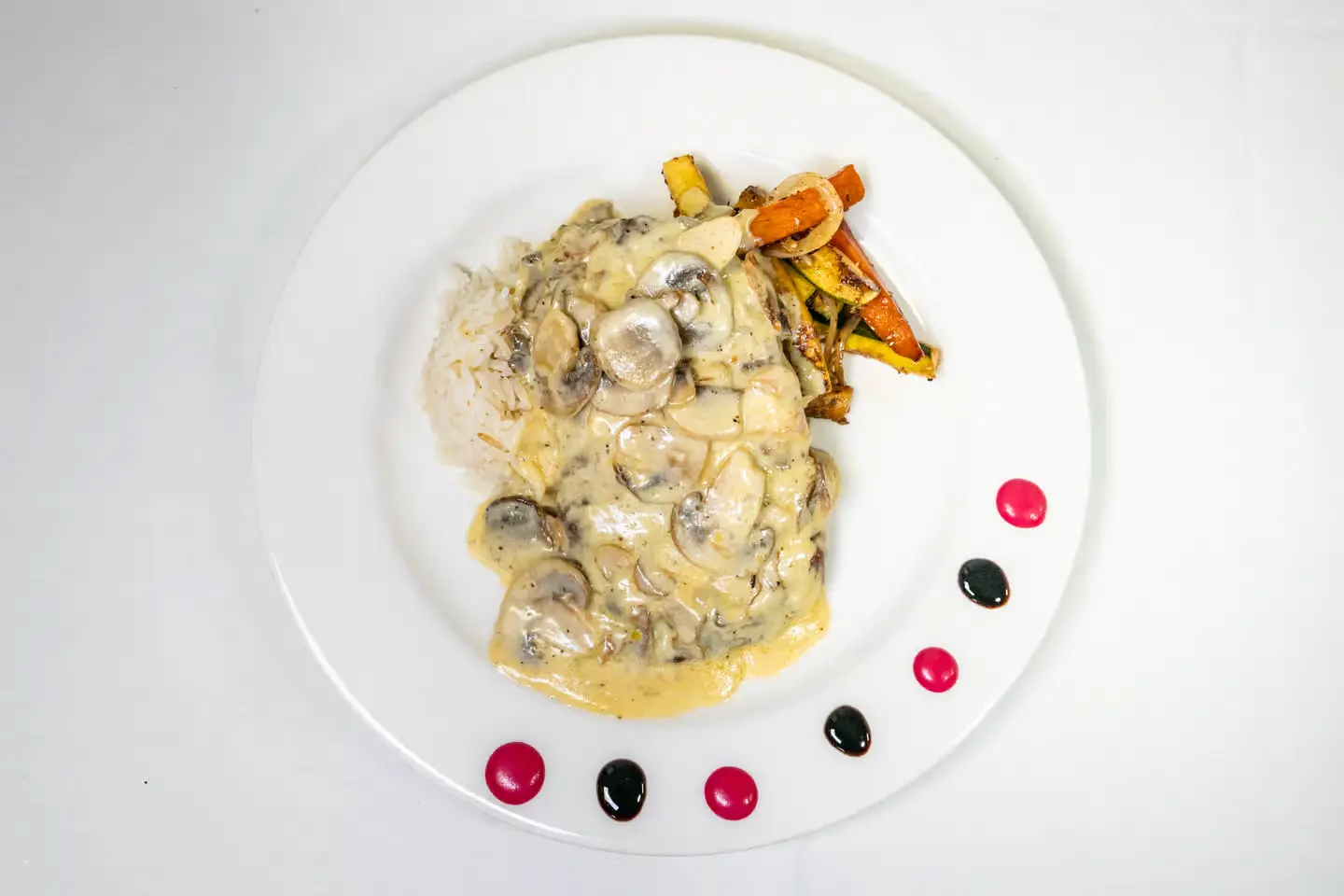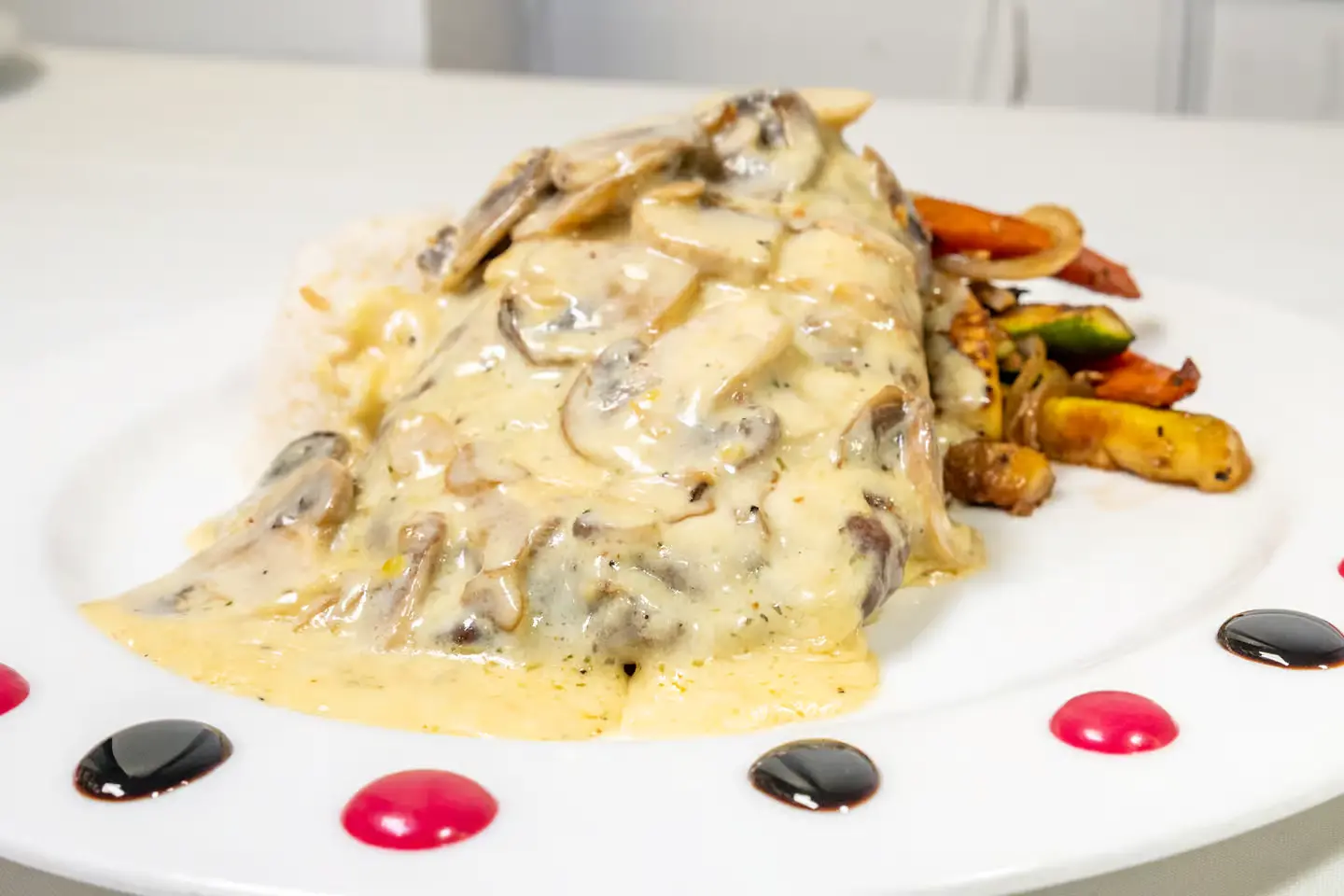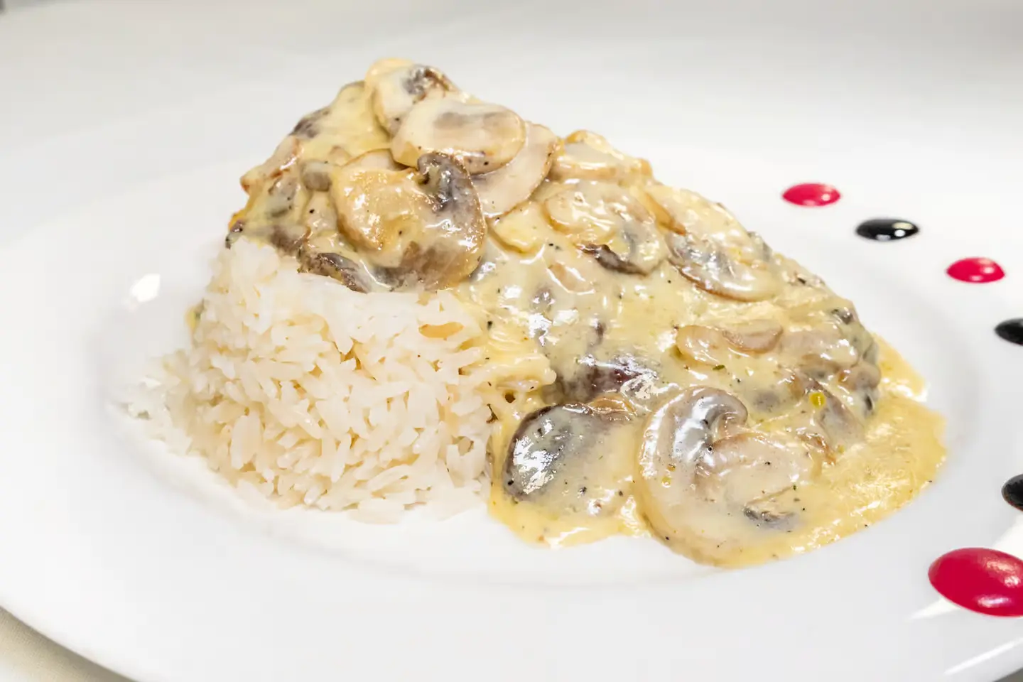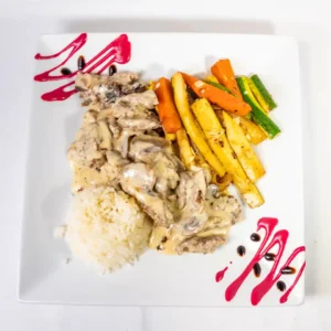Tenderized pork tenderloin, marinated, breaded, fried to perfection, sautéed in delicious creamy mushroom sauced served with rice and veggies