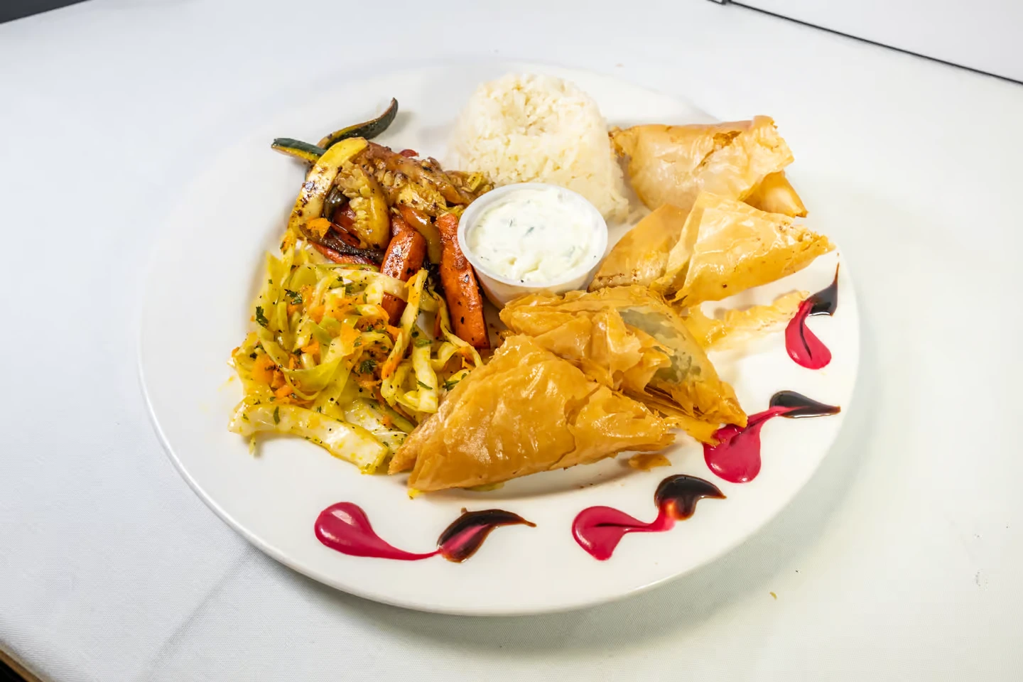 Filo dough stuffed with spinach, feta cheese, and Greek herbs. Served with rice, tzatziki and cabbage salad